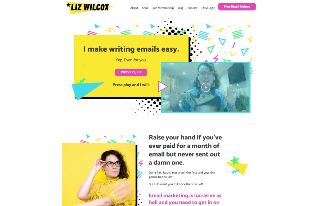 Liz Wilcox’s website looks like the internet threw a 90s-themed birthday party. Bright colors. Playful fonts. Song lyrics from the Backstreet Boys and Britney Spears era. Design elements that most web developers would call “outdated” or “unprofessional.”