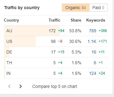 According to traffic analysis data, the blog dominates in Australia—Sharon’s home country. But engagement from other English-speaking markets like the United States, United Kingdom, and Canada lags significantly.
