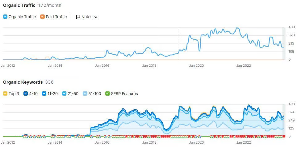 The blog exists but organic traffic is only 172 visits monthly. That’s shockingly low and represents massive missed opportunity.